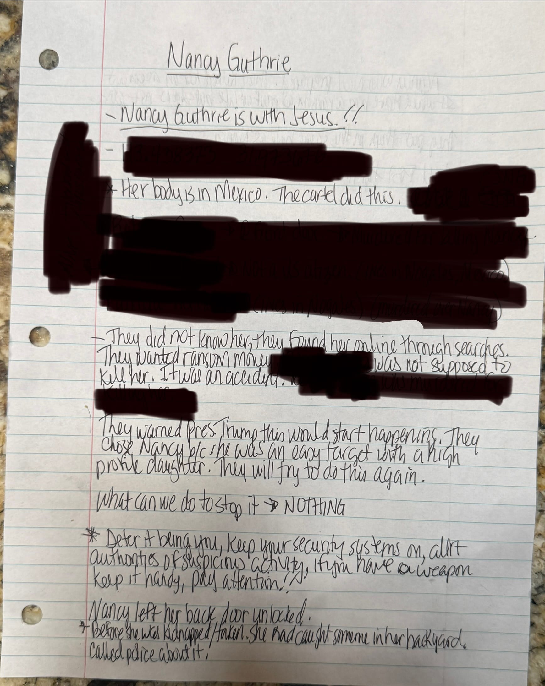 When investigators interviewed me earlier about Nancy Guthrie, I told them that her back door had been left open/unlocked. That detail was only released publicly yesterday.